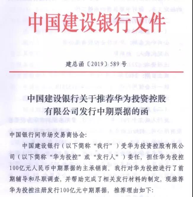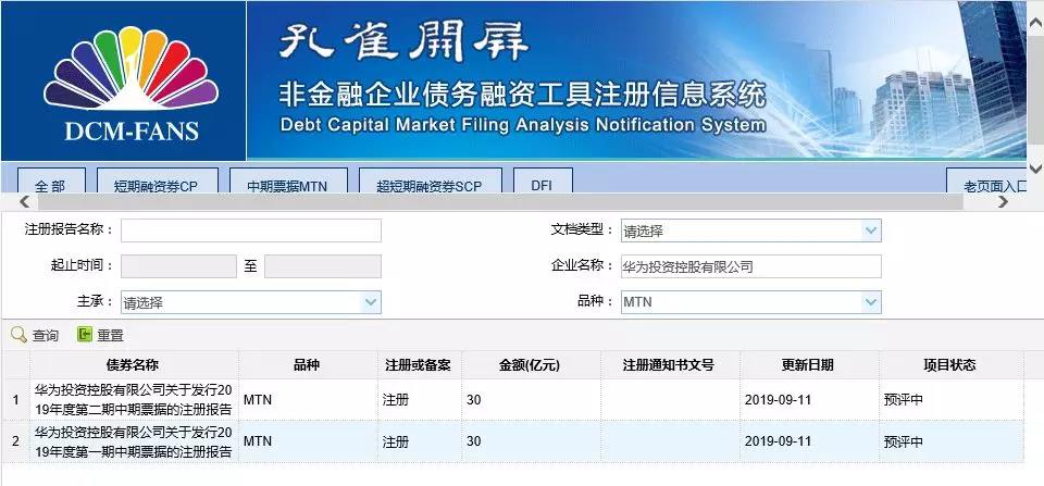 据中国银行间市场交易商协会非金融企业债务融资工具注册系统显示,华为投资控股有限公司(简称“华为”)提交了2019年度第一期/第二期中期票据的注册材料,在境内首次发债。