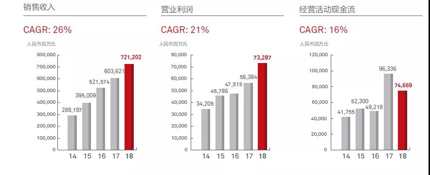 此外,从华为官网披露的财务数据显示,2015-2018年,华为经营活动现金流分别为523亿元、492.18亿元、963.36亿元和746.59亿元。不过,2018年经营活动现金净流量较2017年减少216.77亿元,降幅为22.50%,主要因为2018年加大了研发投入,并且适当增加库存。