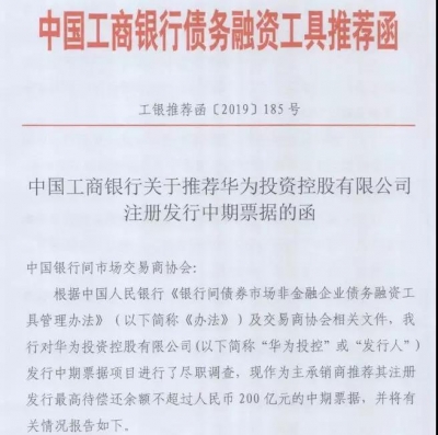两期发行规模各30亿元,期限均为3年;第一期的主承销商为工商银行,第二期的主承销商为建设银行,而根据工行、建行关于推荐华为发行中票的函,华为可注册的最大中票发行规模为300亿元,其中,工行推荐其注册发行不超过200亿元,建行推荐其注册发行100亿元。