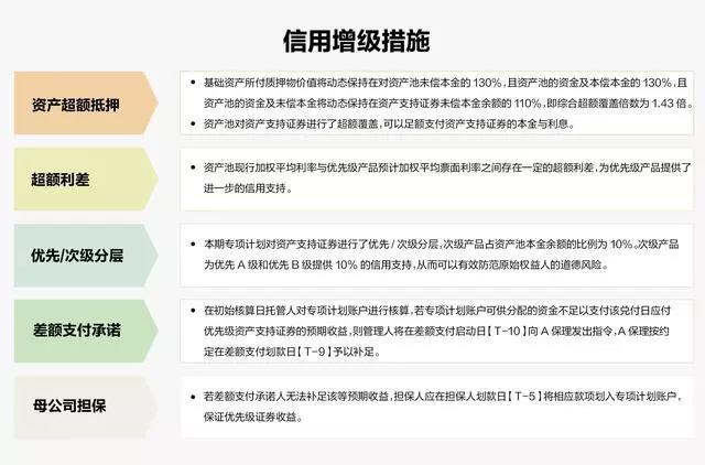5. 信用提升机制:即增信措施,包括内部增信、外部增信,常用的如优先次级分层、第三方担保等;