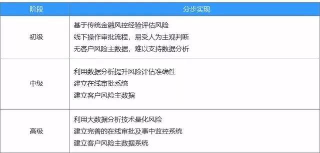 完善的风险主数据管理使风控数据维度更完整全面、信息提取更高效,避免人为因素干扰,为风险建模打下坚实基础;基于 IT 系统的审批流程进一步减少人为因素影响,提升审批效率,而事中风险监控体系可以确保异常情况的及时处理;基于大数据分析的量化风险模型帮助企业充分利用数据资产,预测风险,是金融风险定价的基础。建立风控模型,可以从下面三个阶段入手,分步实现: