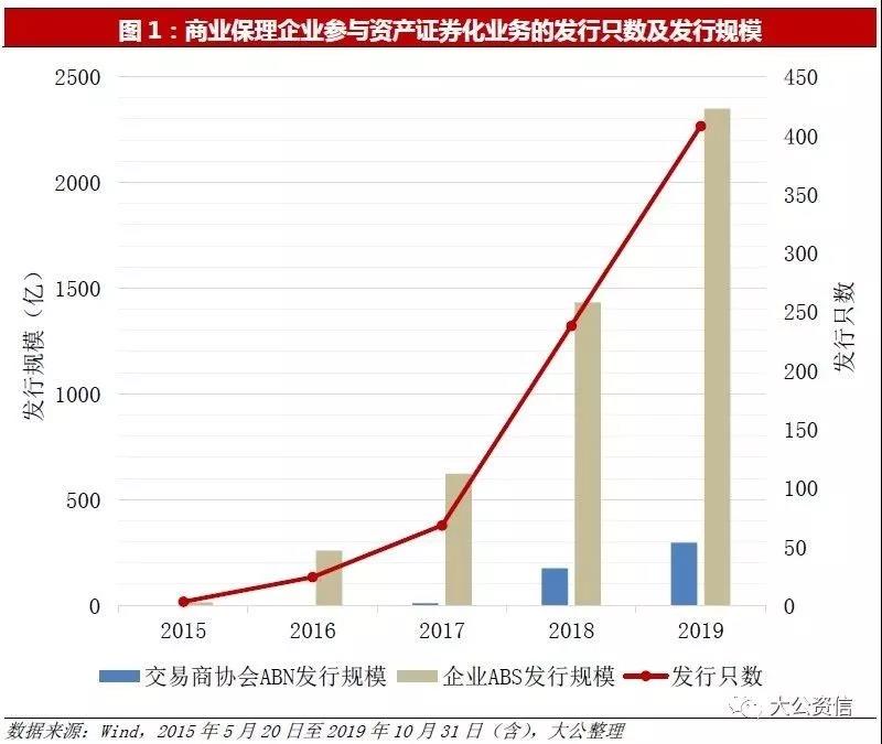 商业保理企业作为原始权益人的资产证券化业务开展较晚, 2015 年仅发布商业保理资产证券化业务 3 单。后续融资规模及发行只数逐年增长,据 Wind 数据整理,截至 2019 年 10 月 31 日,商业保理企业作为原始权益人的资产证券化产品累计发行 736 只,累计发行规模 5,139 亿元。