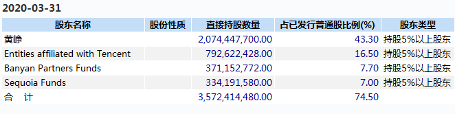不过,上市两年多后,拼多多股权结构有所变化,部分投资机构退出。截至2020年3月31日,wind显示,黄峥个人仍持有43.3%股权,其次是腾讯通过旗下投资公司持有16.5%股权,以及红杉资本持有7%股权。