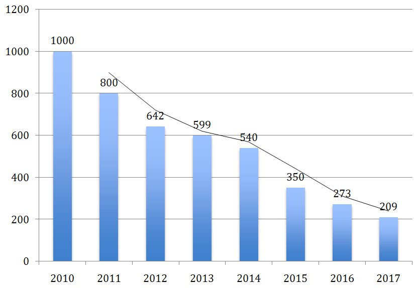 图4 2010~2017年锂离子电池价格(单位:美元/千瓦时)