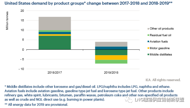 2017-2018年及2018-2019年美国石油产品组合需求变化