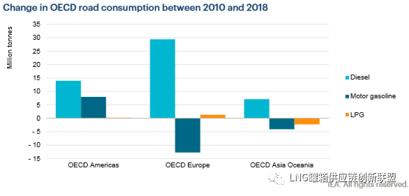 道路运输柴油的消费量自2010年以来一直在增长。就经合组织欧洲和经合组织亚洲大洋洲区域而言,