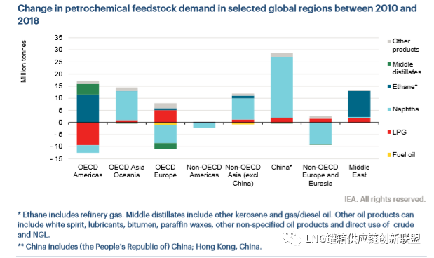 石脑油仍然是化工和石化行业非能源消费的主要原料(2010年至2018 年增长11.0%, 2300万吨), 特别是在亚洲市场。在其他地方, 石脑油在石化原料中所占的份额正在减少, 液化石油气和乙烷更受青睐。后者的增长在经合组织美洲和中东尤其重要。由于拥有丰富的天然气供应, 这两个地区在获得低成本乙烷方面具有原料优势。