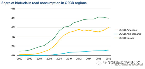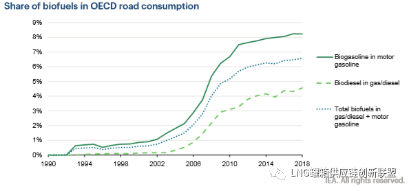 在经合组织(OECD)国家,2018年液体生物燃料在道路运输消费中的整体份额比2017年有所增长, 增长率为6.6%。这反映出与柴油混合的生物燃料所占比例有所上升(从2017年的4.3%上升到2018年的4.6%), 而与汽油混合的生物燃料所占比例保持在8.2%不变。2018年, 生物柴油在汽油/柴油中的使用量达到最高水平(2100万 吨), 但与车用汽油中的生物汽油(5000万 吨)相比, 生物柴油的使用量仍然很小。