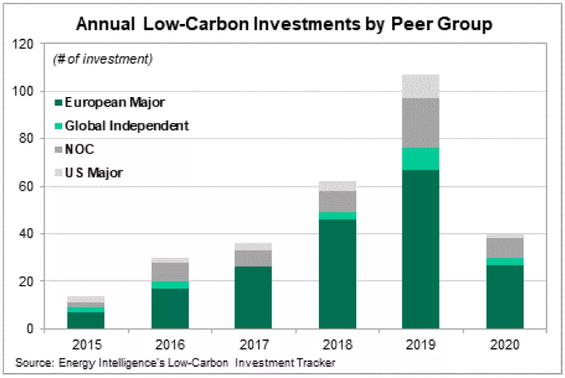 欧洲油气生产商拥有最为激进的低碳减排目标,在投资总量等指标上处于领先,因此,在所谓的“低碳投资追踪体系”评价中也排名靠前。在该套体系对25个国际石油公司、国家石油公司、独立石油公司的评价中,欧洲石油巨头(Shell、bp、Total)和挪威国油(Equinor)在2015年以来披露的300项投资中占比90%。