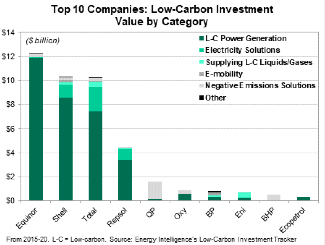 近期,可再生能源发电业务成为能源转型投资类型的热点,在挪威国油、壳牌、道达尔和雷普索尔这样追求业务多元化发展的公司中,可再生发电业务领域的投资成为一段时间以来资本投入的主导。但是现实世界里,低碳投入有许多方式。电力解决方案就包括在电网储存、电池技术和电力需求管理等方面的投资以及通过电动汽车充电支持终端用户和相关服务。低碳资金可以用来发展氢能和生物质能等新能源以降低天然气的碳排放集中度,也可以通过生产生物质基产品替代石油基的产品来实现低碳转型发展。