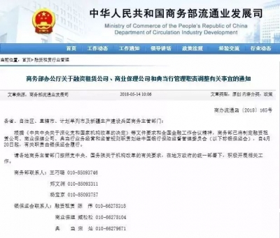 商务部:融资租赁、商业保理和典当行划归银保监会 有关职责由银保监会履行