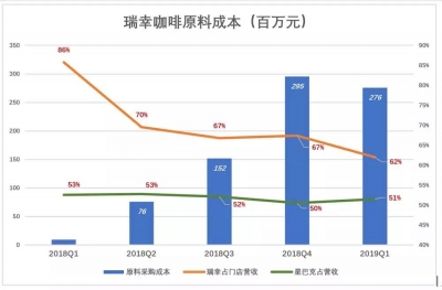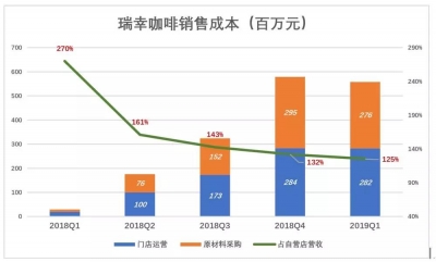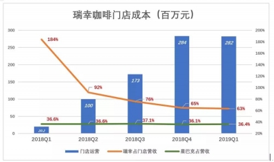 2018 年,瑞幸门店运营成本5.76亿元,占门店销售收入的73.3%。而星巴克门店运营成本占自营店收入的比例稳定在37%一线。