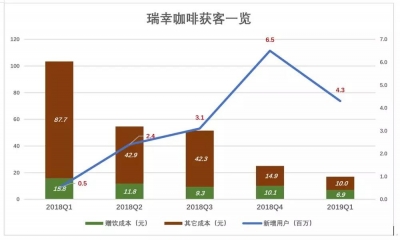 2018 年Q1“冷启动”,获客成本高达103.5元,其中赠饮成本15.8元/人,其它成本87.7元/人 (品牌广告、效果广告、APP推广、线下活动等) 。