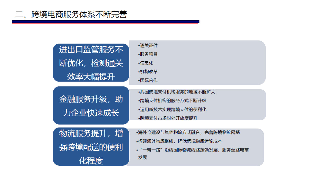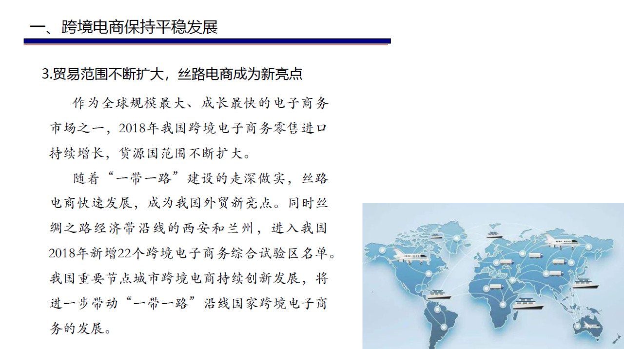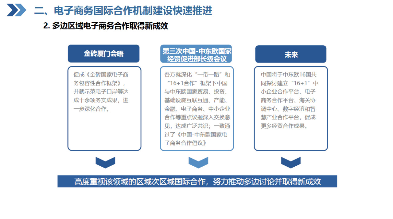 1.跨境电子商务交易总额不断增长,结构优化升级;2. 跨境电子商务国内区域发展逐步均衡,中西部地区成为新增长点;3. 跨境电子商务国际范围不断扩大,丝路电商成为新亮点。