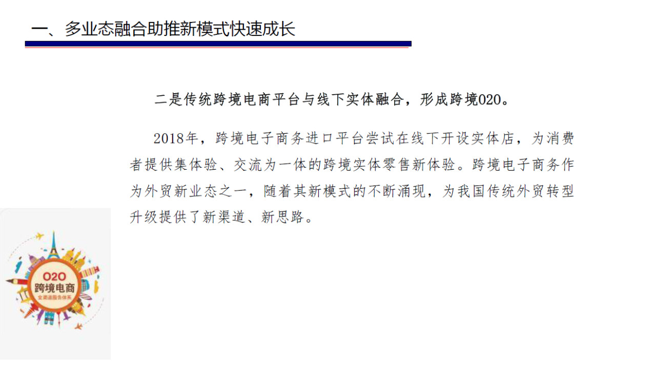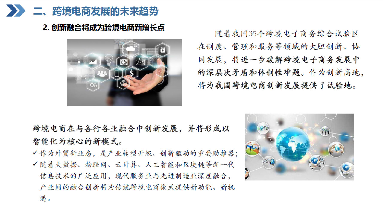 1.社交平台与跨境电子商务融合,形成短视频电商,成为跨境电子商务的新增长点;2.传统跨境电商平台与线下实体融合,形成跨境O2O。