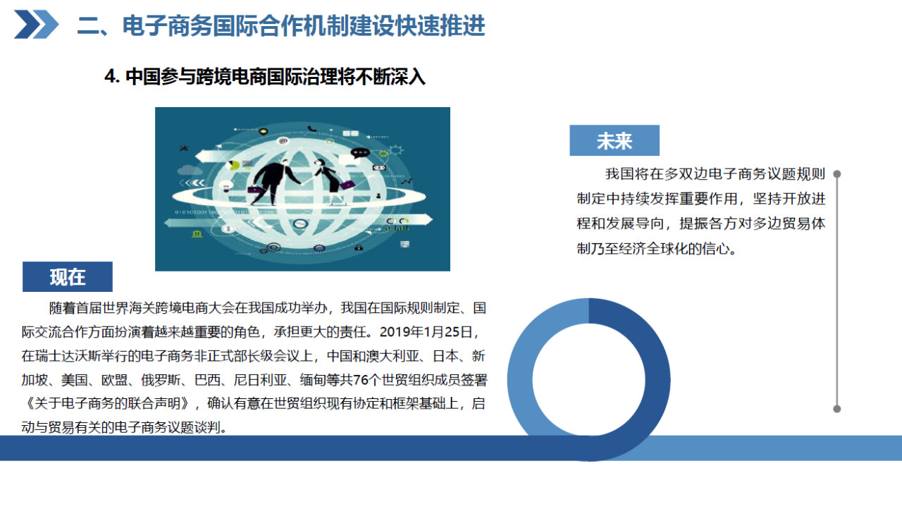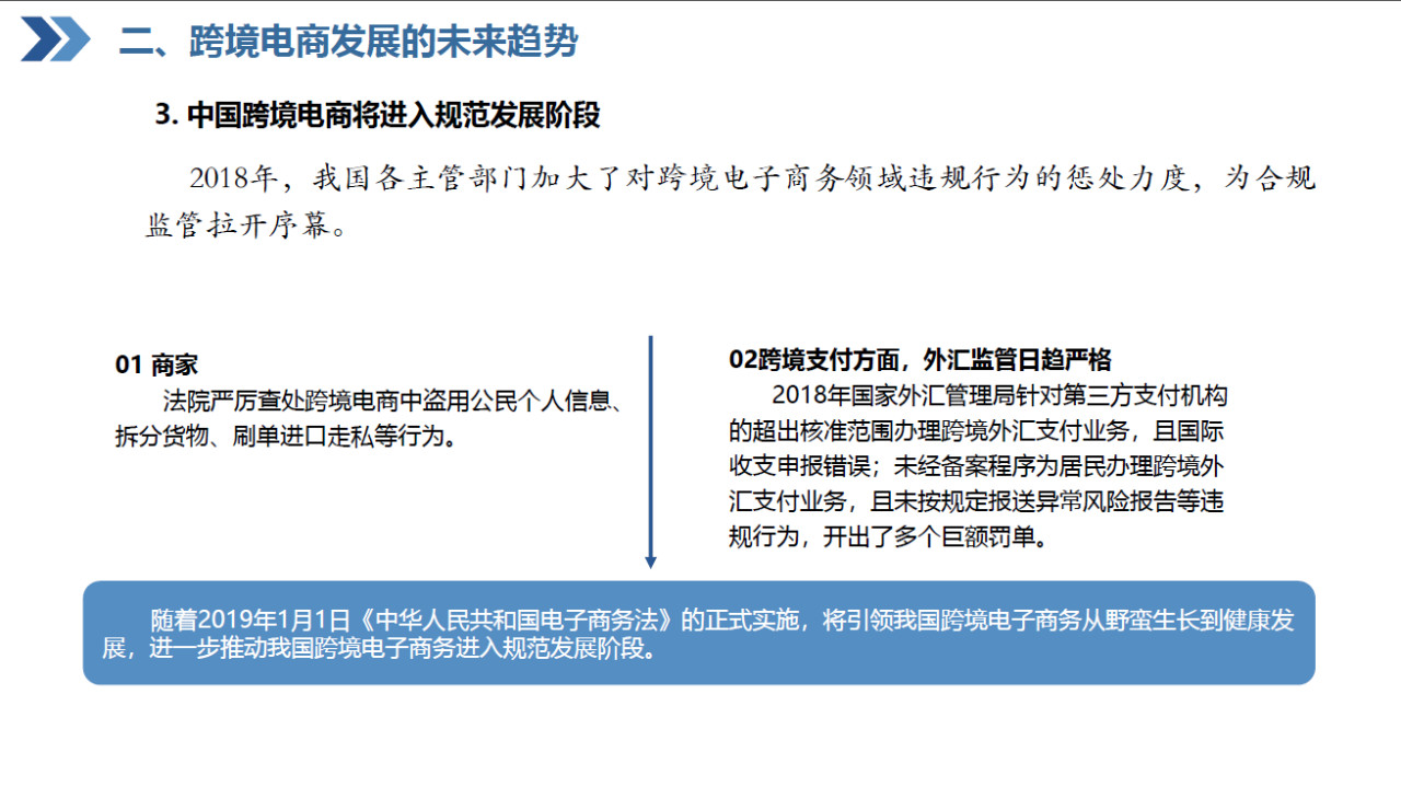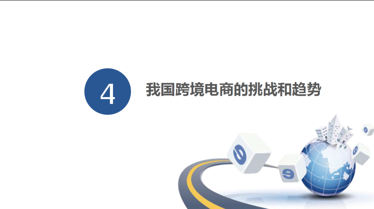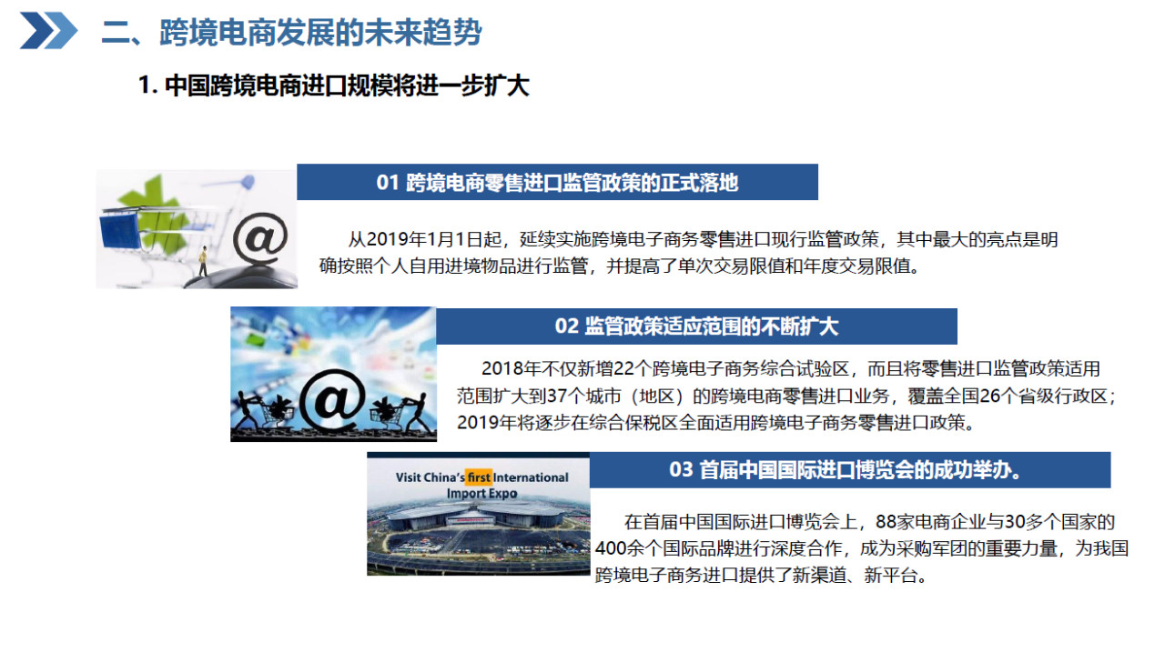 1.我国跨境电子商务进口将进一步扩大;2.融合创新将成为跨境电子商务的新增长点;3.跨境电子商务将进入规范发展阶段;4.我国参与跨境电子商务国际治理将不断深入。