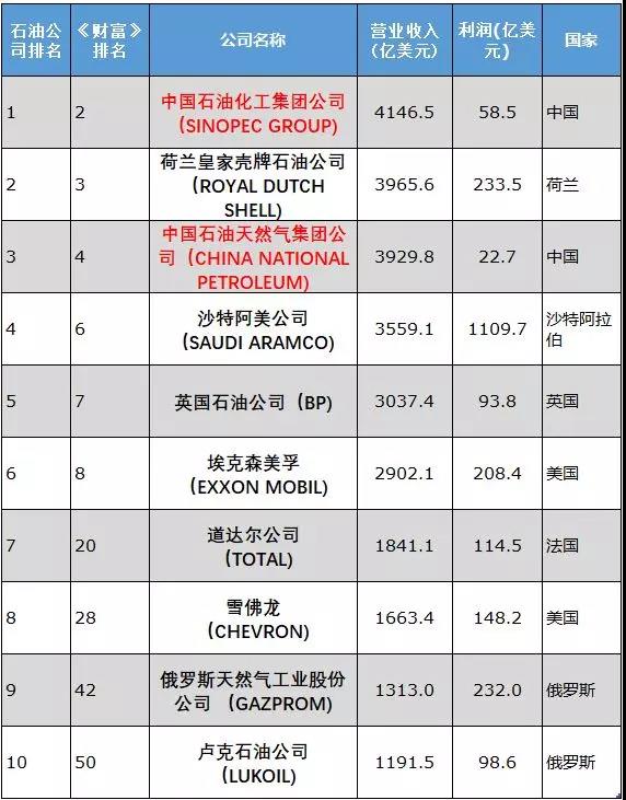 世界10大石油公司榜单中, 中石化 营收同比提升了近千亿美元, 继续稳居榜首 ,中石油紧随其后,位列第三位。