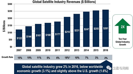 2007-2016年全球卫星产业收入状况。产值从2007年的1220亿美元到2016年的2610亿美元,10年间增长约2 倍。