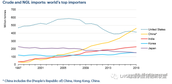 2018年, 中国超过美国成为全球上最大的原油和天然气凝析油进口国(+10%,+4200万吨), 而美国的一级原油进口自2014年之后维持持续增长以来, 首次显著下降(+2.7%,+1100万吨), 同时国内产量持续增长(+15%)。美国的初步数据显示, 这一趋势将持续到2019年, 美国国内产量进一步增长(+11%), 与此同时, 美国初级石油产品进口下降(-11%)更为强劲。
