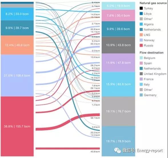 2018 年,德国进口天然气789亿立方米,占欧盟进口天然气比立的19.7%,意大利638亿立方米,占欧盟进口天然气比立的15.9%和法国4789亿立方米,占欧盟进口天然气比立的11.9%是天然气的主要进口国。综合来看,这三个国家几乎占欧洲天然气进口总量的一半。俄罗斯出售给欧洲的天然气主要运输方式为管道天然气,所以价格上也确实便宜。2018年俄罗斯出售给欧盟俄天然气价格基本上为每千立方米245.5美元(按照分段价格原则,沿线不同国家终端价格不同。)。其中德国一家就从俄罗斯进口408亿立方米天然气接近整个欧盟进口天然气总量的10%。