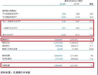 以天津银行为例。天津银行的财务资料显示,其2018年上半年的资本充足率、营业收入、净利润等指标都较去年同期有所提高。